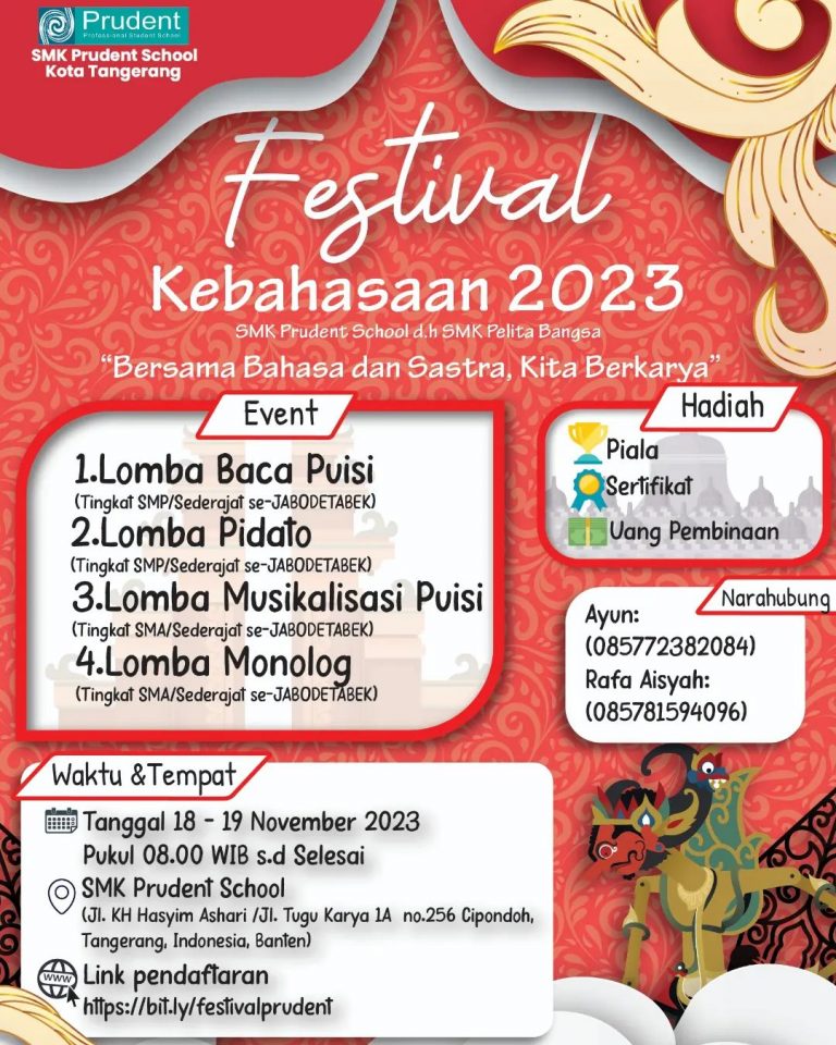 PrudentSchool-Kota Tangerang, Assalamu’alaikum warahmatullahi wabarakatuh Salam sejahtera bagi kita semua. Halo.. halo.. hai.. Sahabat Prudentšš» Ada informasi terbaru nih tentang Festival Kebahasaan yang akan diadakan di SMK Prudent School, yang diperuntukkan bagi pelajar tingkat SMP/Sederajat dan SMA/Sederajat se-JABODETABEK. Jadi, kapanā¦